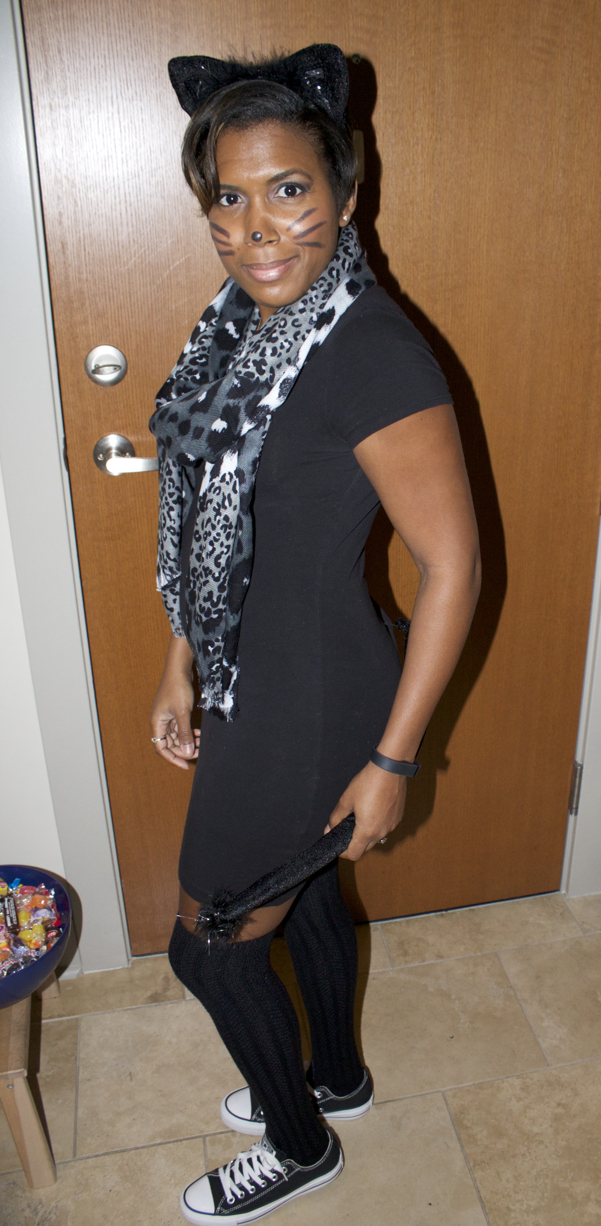 I may have had a costume on Saturday for a party but that didn’t stop me from doing something today. I’d bought these ears when I was putting together my Queen of Hearts costume to wear today – Halloween Day. I decided to just wear all black today and be comfortable while I ran a few errands after taking my husband to work. I bought the tail today just for fun and put it on half way through the trick or treaters coming. It was my first time giving out candy to Trick or Treaters and I may have bought too much so I’m going to send my husband to work with all of the candy so that I don’t overdose on it :P. I threw on my scarf that I got from Nordstrom Rack just to add to the catty look. I didn’t draw on my nose and and whiskers until this evening either. The chucks? I prefer comfort sometimes over style :).